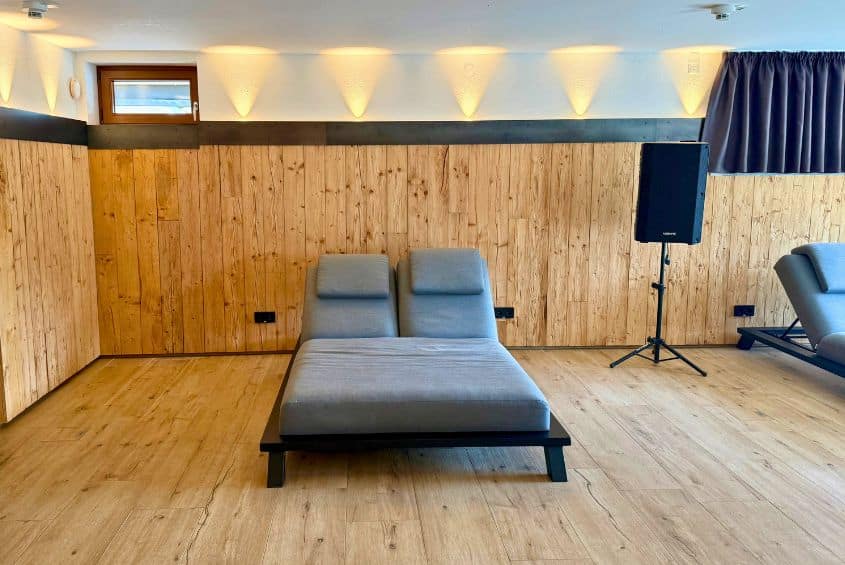 Zeit zum Nachruhen: Nach dem Saunagang laden unsere komfortablen, ergonomisch geformten Ruheliegen zum Verweilen ein. Kuscheln Sie sich in ein weiches Handtuch, das wir frisch für Sie bereithalten, und genießen Sie die Stille. Ein Lautsprecher sorgt auf Wunsch für dezente Hintergrundmusik, um Ihre Entspannung zu vertiefen.